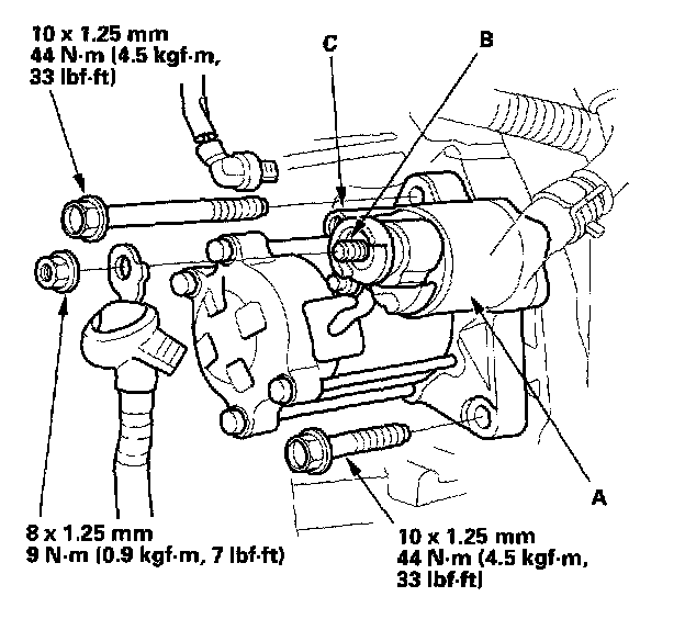 7. Disconnect the starter cable from the B terminal on the starter solenoid (A), then disconnect the BLK/WHT wire from the S terminal (C).