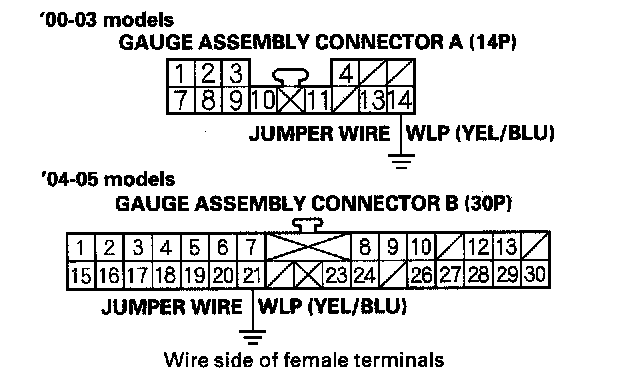 6. Connect gauge assembly connector A (14P) terminal No. 14 to body ground with a jumper wire.