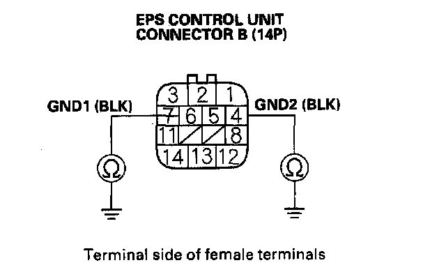 11. Check for continuity between body ground and EPS control unit connector B (14P) terminals No. 4 and No. 6 individually.