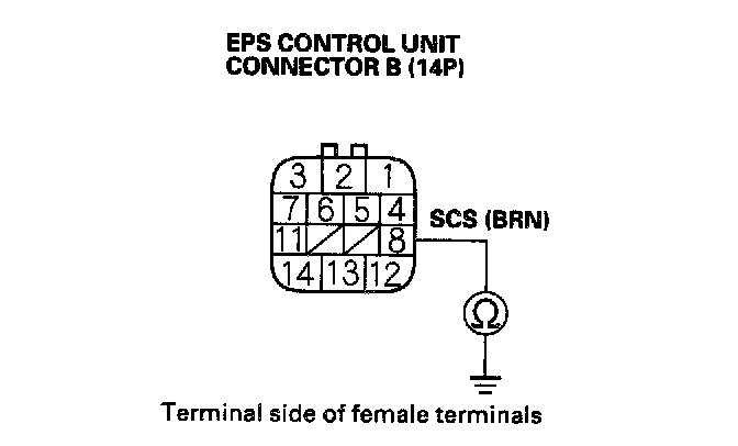 16. Check for continuity between EPS control unit connector B (14P) terminal No. 8 and body ground.
