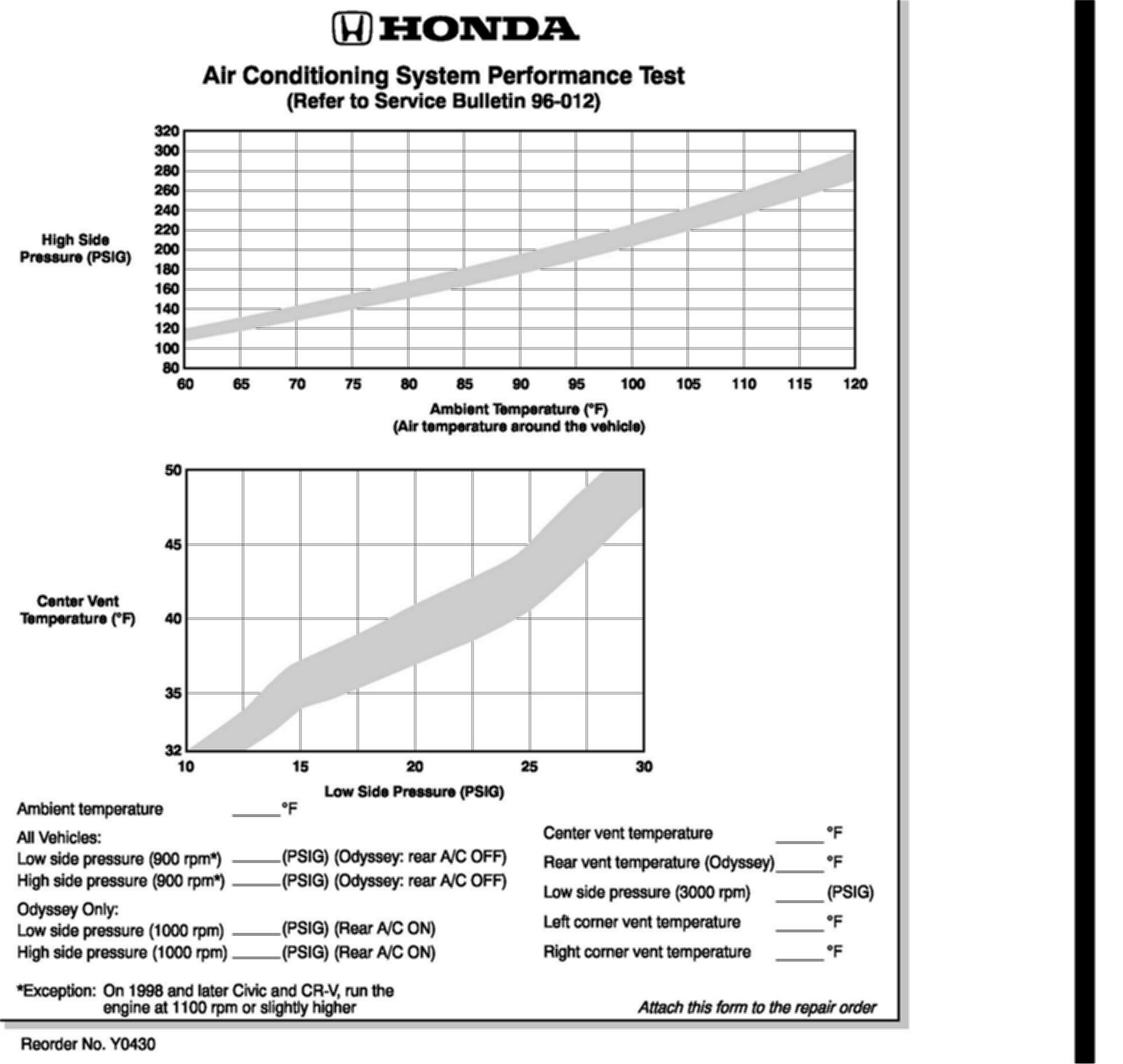 4. Odyssey only: Turn the rear A/C fan unit on high. Check the A/C system pressures on the low and high sides with the engine running at 1000 rpm. Write down the pressure readings on the form.