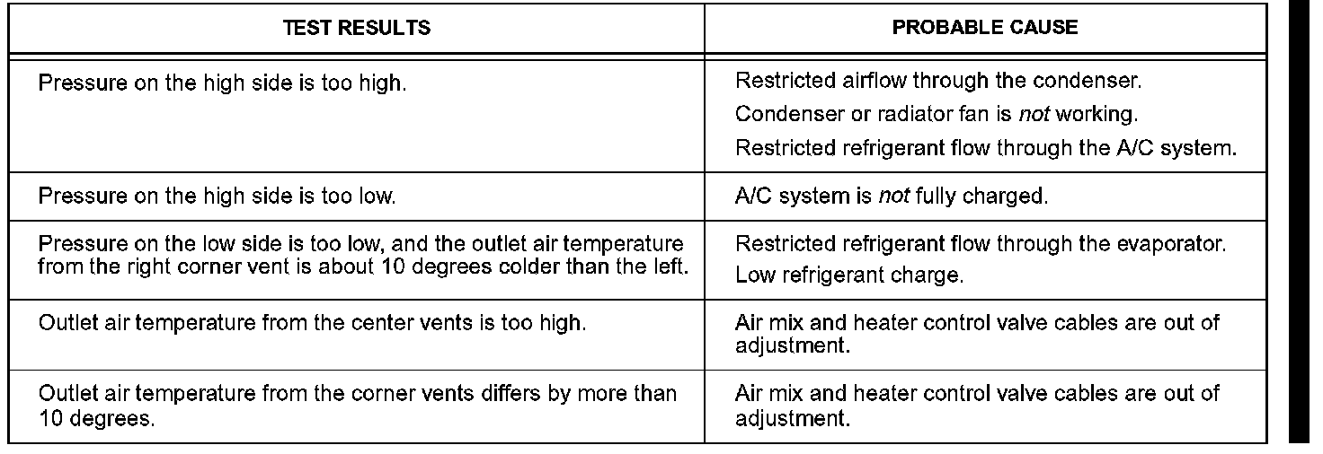Here are some problems that cause test results to be out of specification. For more information, refer to the Pressure Test chart in the HVAC section of the appropriate service manual.