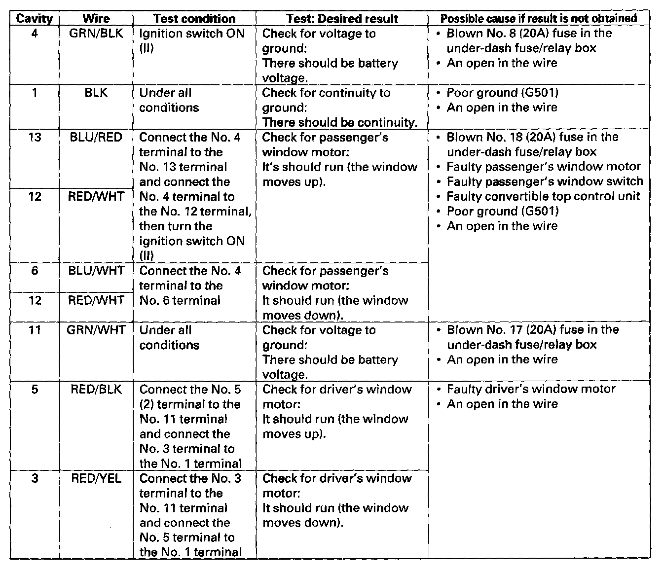 5. With the power window master switch still disconnected, make these input tests at the 14P connector.