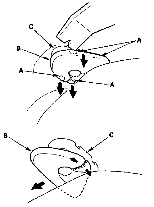 2. From both sides, using a trim tool, release the tabs (A), then turn the sunvisor cap (B), and remove it from the bracket (C).