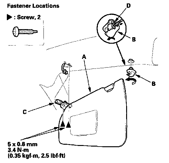 9. Without side curtain airbag: If necessary, detach the hooks (A) and the clip (B), then remove the front roof side pad (C) and rear roof side pad (D).