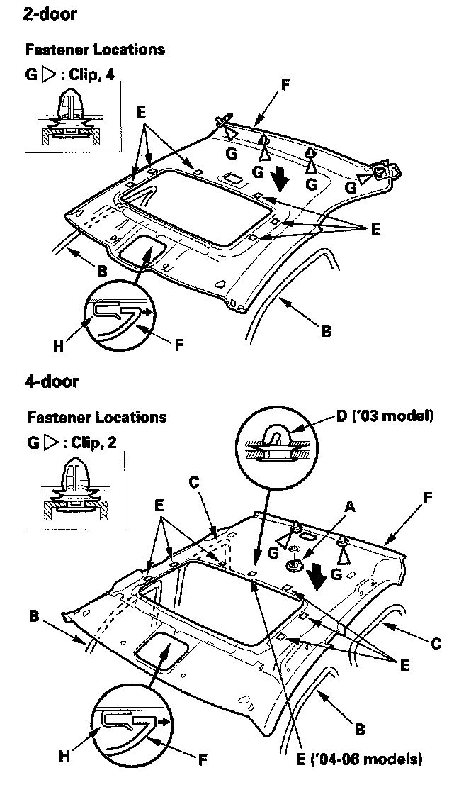 4. With the help of an assistant, detach the rear clips (G) by pulling the rear portion of the headliner down, and release the headliner from the moonroof frame (H) by sliding the headliner rearward, and lowering it.