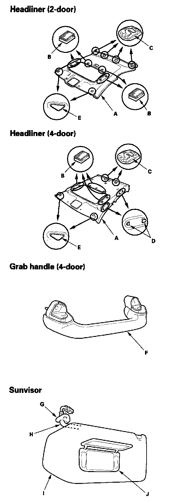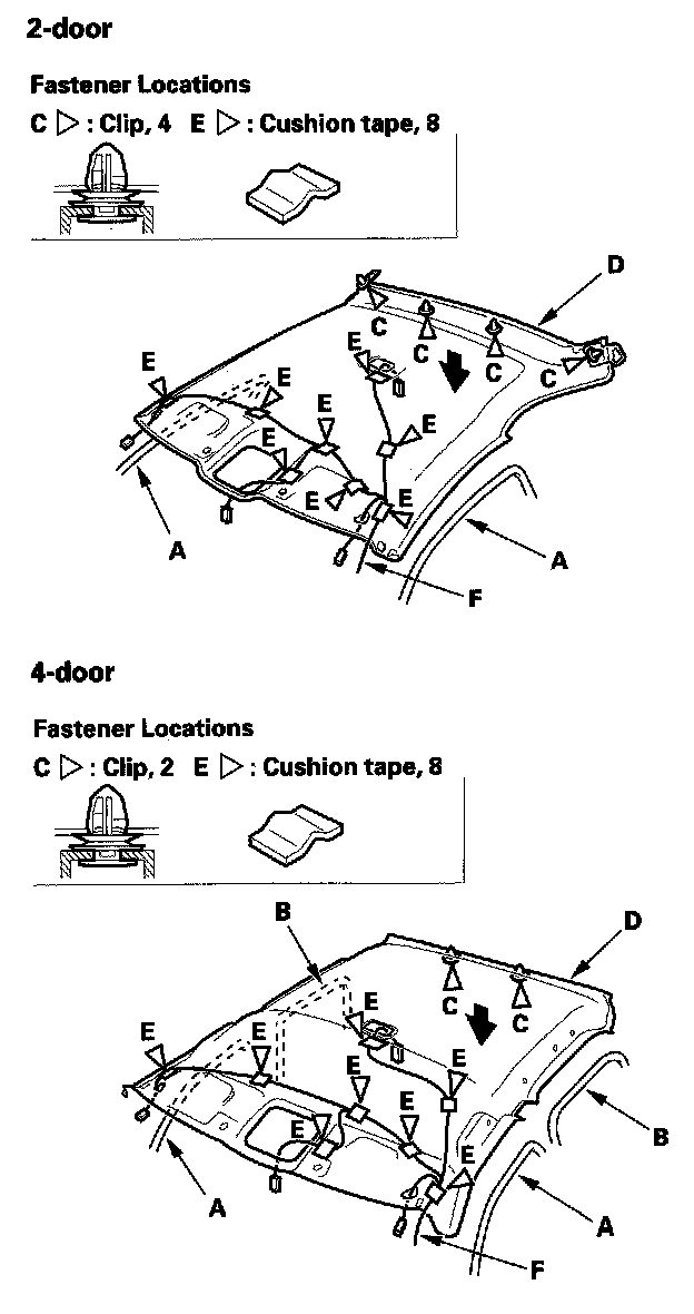 3. Detach the clip (D) (4-door), and release the fasteners (E) by pulling the front portion of the headliner (F) down.