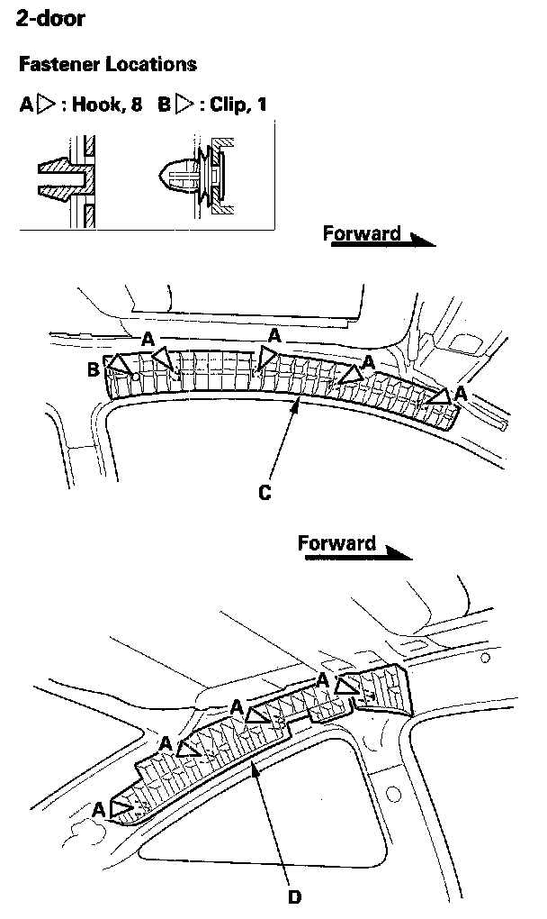 - B-pillar lower trim, 4-door without side curtain airbags, 4-door with side curtain airbags- B-pillar upper trim, both sides, 2-door without side curtain airbags, 2-door with side curtain airbags , 4-door without side curtain airbags , 4-door with side curtain airbags