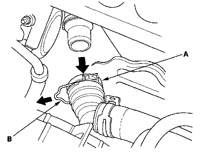 11. Push down the lock (A), then push the quick connector (B) onto the thermostat cover until you hear it click.