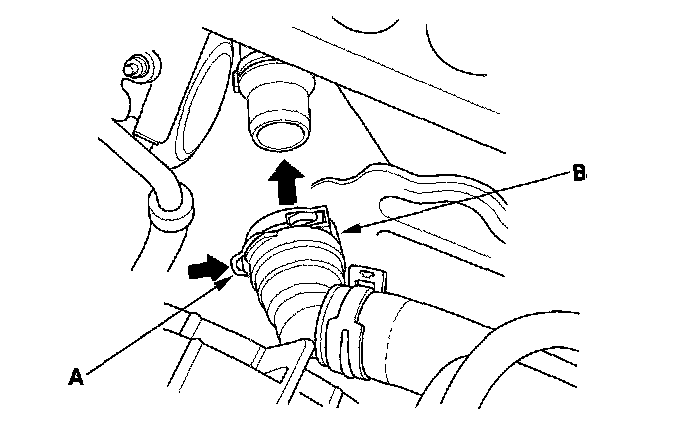 3. Pull out lock (B) by hand, then wiggle the quick connector loose, and remove it from the thermostat cover. Do not use any tools to remove the quick connector.