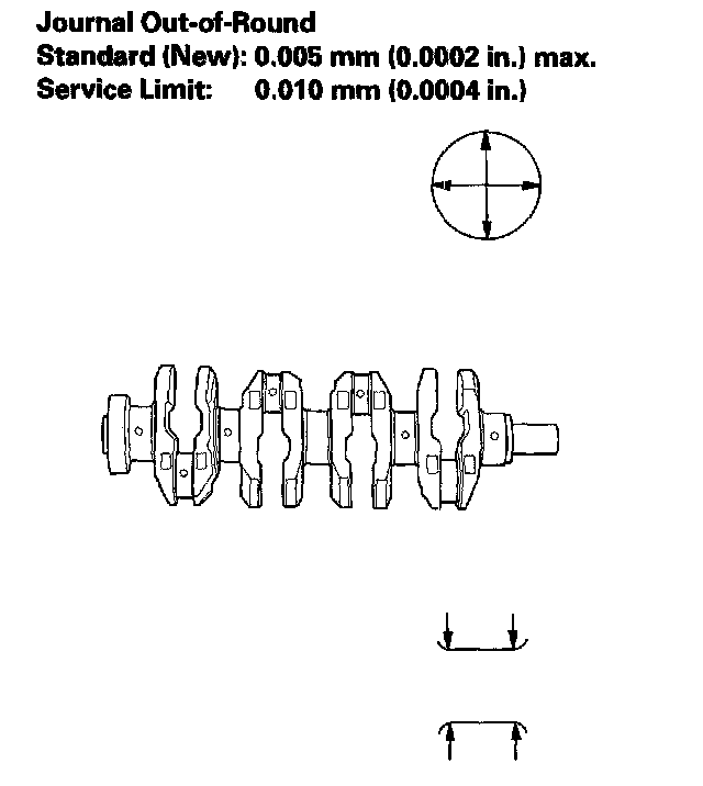 4. Measure out-of round at the middle of each rod and main journal in two places. The difference between measurements on each journal must not be more than the service limit.