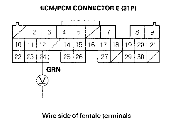 9. Using a backprobe set, measure the voltage between the No.12 terminal of ECM/PCM connector E (31P) and body ground with the ECM/PCM connectors connected.