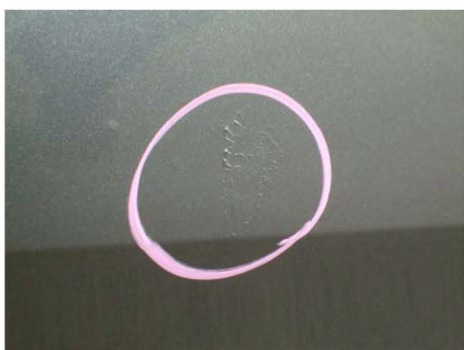 ^ Before taking photos, outline the paint defect with a wide-tip Sharpie marker pen, a crayon, a grease pencil, masking tape, or stick-on paper notes. The marking material must contrast with the color of the paint, and should clearly identify the paint defect area.