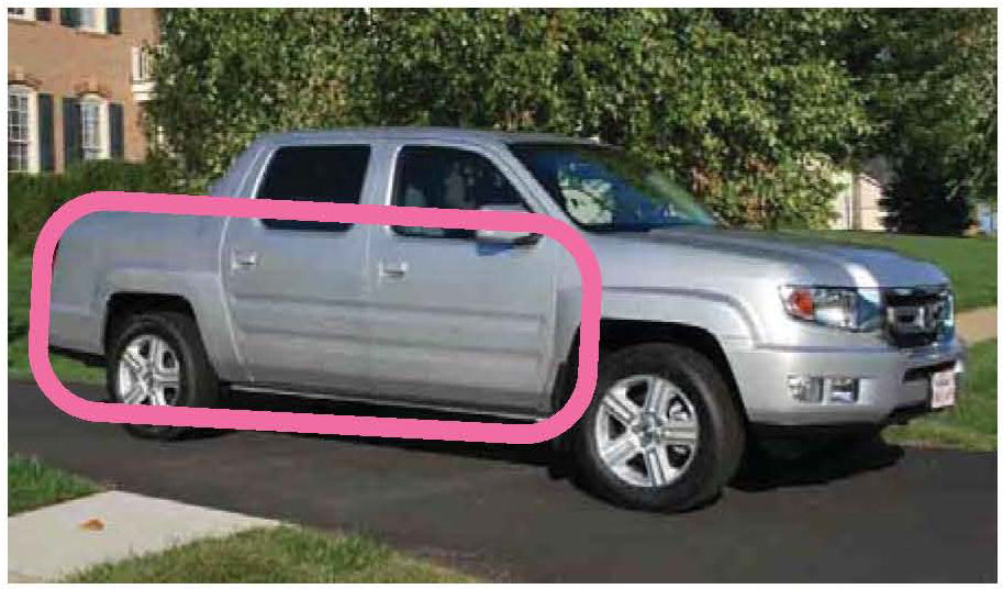 Photo Two: Take an orientation shot of the entire paint defect area, with the lens zoomed out wide enough to show the defect's location in relation to other body parts, such as door handles, windshield, headlights, bumper, side windows, wheel, etc.