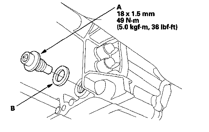 6. Remove the drain plug (A), and drain the automatic transmission fluid (ATF). Then reinstall the drain plug with a new sealing washer (B).