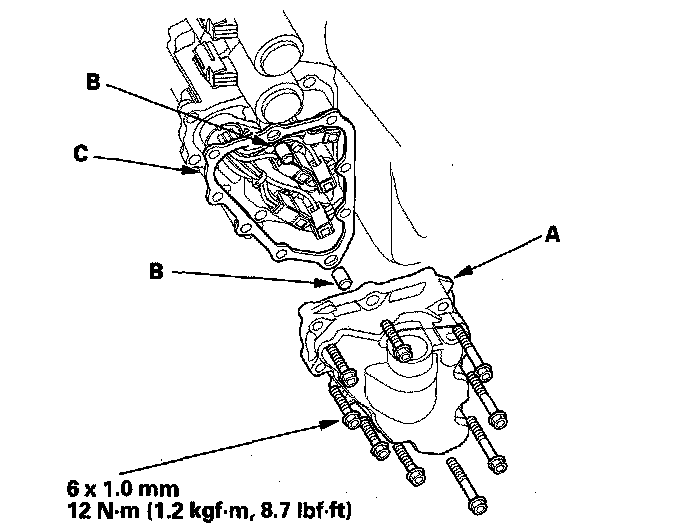 18. Remove the shift solenoid valve cover (A), dowel pins (B), and gasket (C).