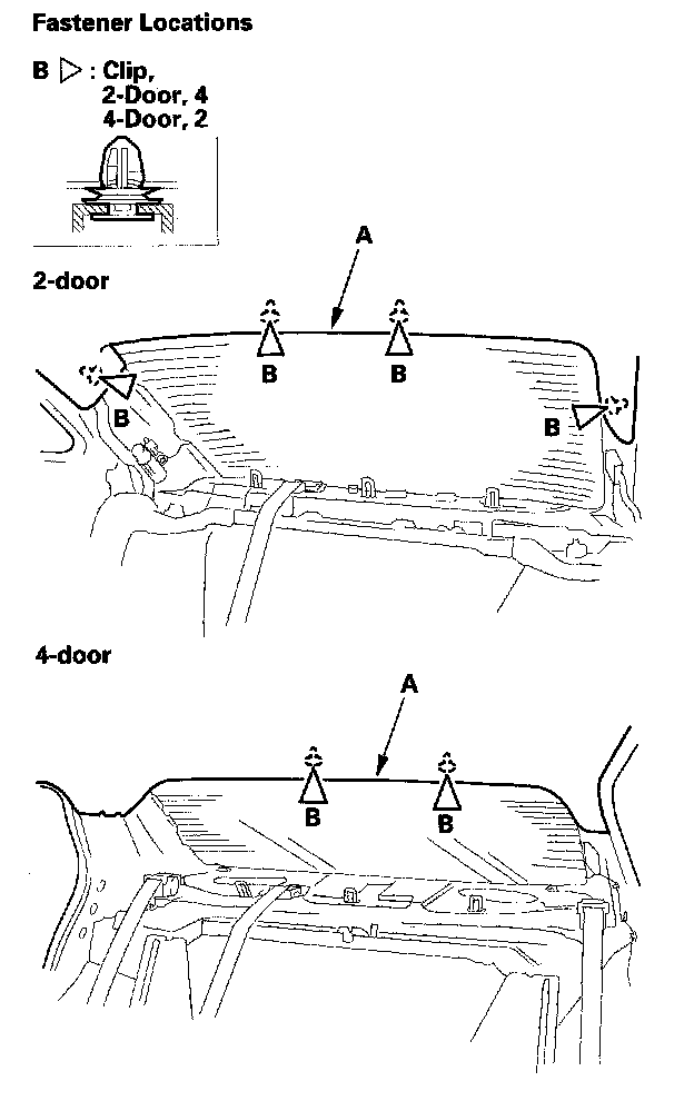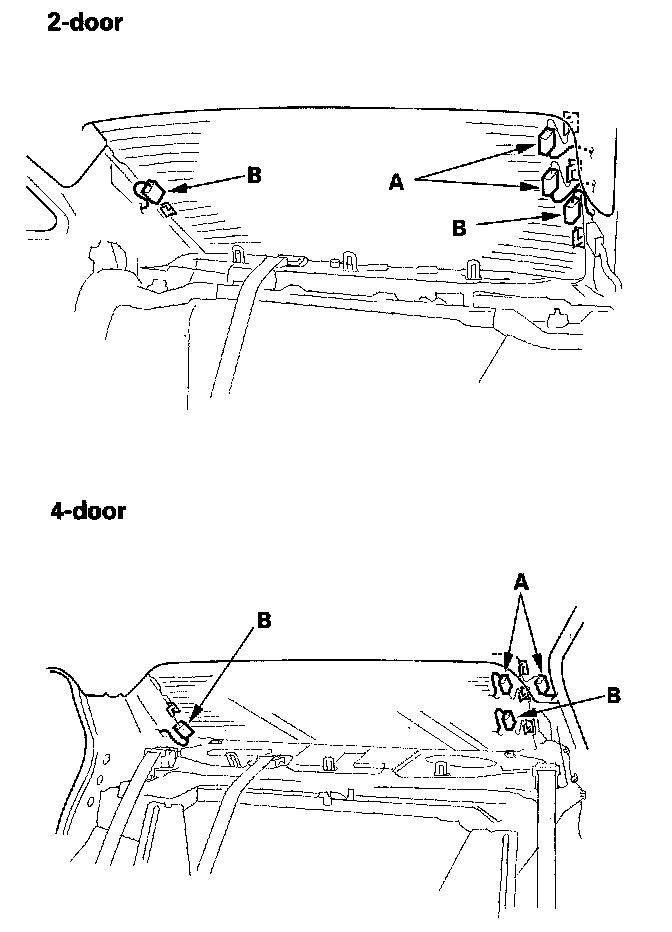 4. Pull down the rear portion of the headliner (A) by detaching the clips (B). Take care not to bend the headliner excessively, as you may crease or break it.
