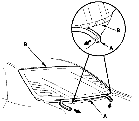 6. Remove the molding (A) from the lower edge of the rear window (B). If necessary, cut the molding with a utility knife.