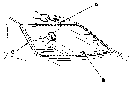 19. With a sponge, apply a light coat of glass primer along the edge of the rear window (A) between the dams (B) and molding (C) as shown, then lightly wipe it off with gauze or cheesecloth: