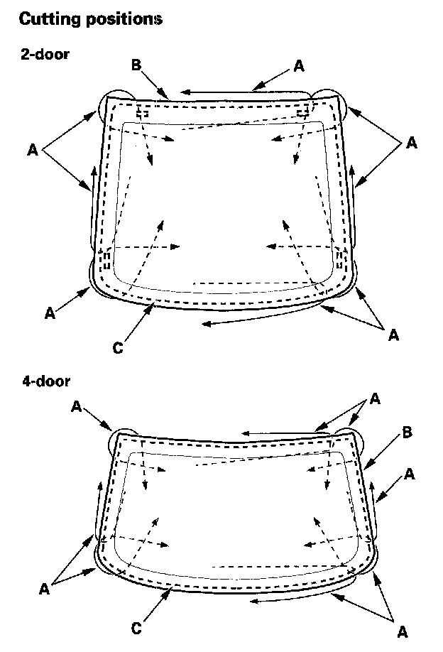 7. With a helper on the outside, pull the piano wire (A) back and forth in a sawing motion. Hold the piano wire as close to the rear window (B) as possible to prevent damage to the body, and carefully cut through the adhesive (C) around the entire rear window.