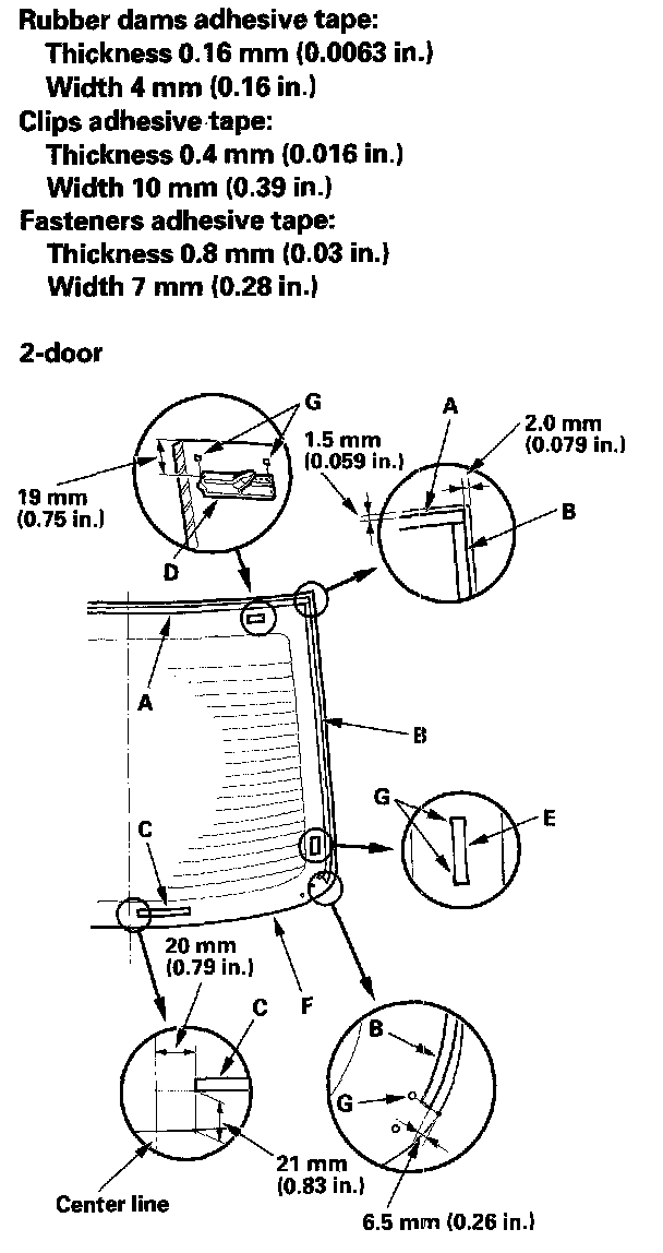 12. Attach the upper rubber dam (A), side rubber dam (B), lower rubber dam (C), clips (D), and fasteners (E) with adhesive tape to the inside face of the rear window (F) as shown: