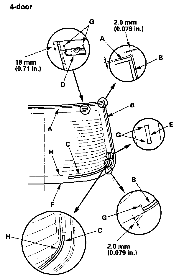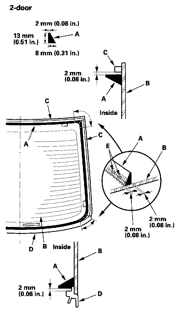 - 2-door: With the printed dots (E) on the rear window as a guide, apply the adhesive to both side portions of the rear window.