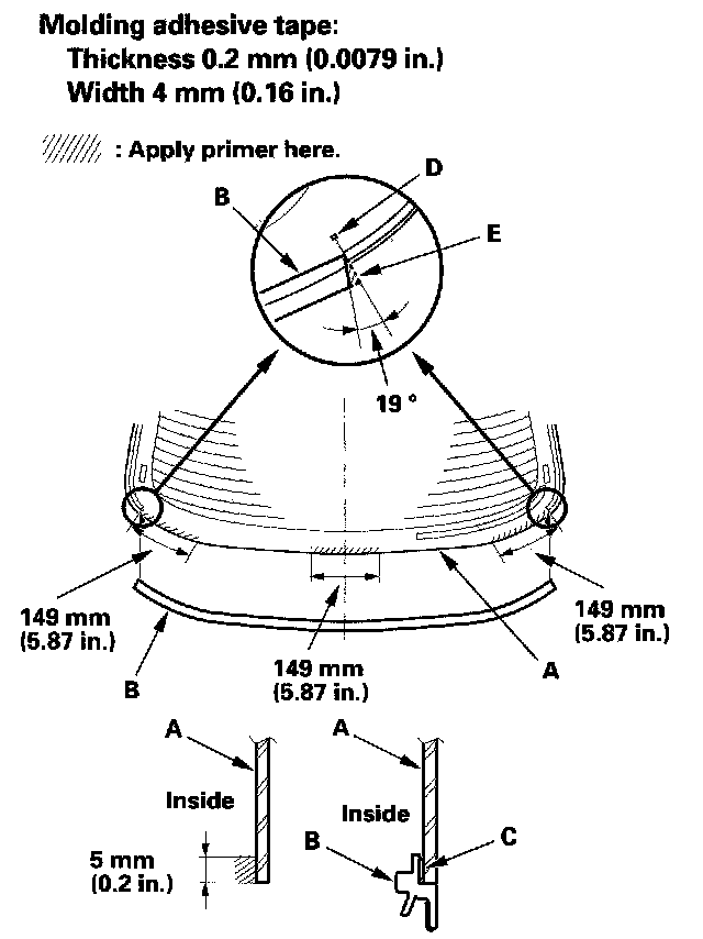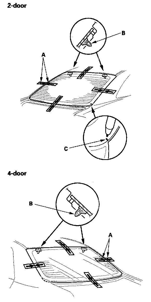 18. 2-door: Apply primer to the edge of the rear window (A) where the molding adhesive tape will be attached as shown. Attach the molding (B) with adhesive tape (C) to the lower edge of the rear window: