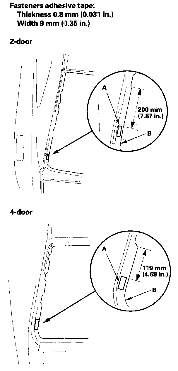 14. Attach the fasteners (A) with adhesive tape to the rear window opening flange (B) of the body on both sides.