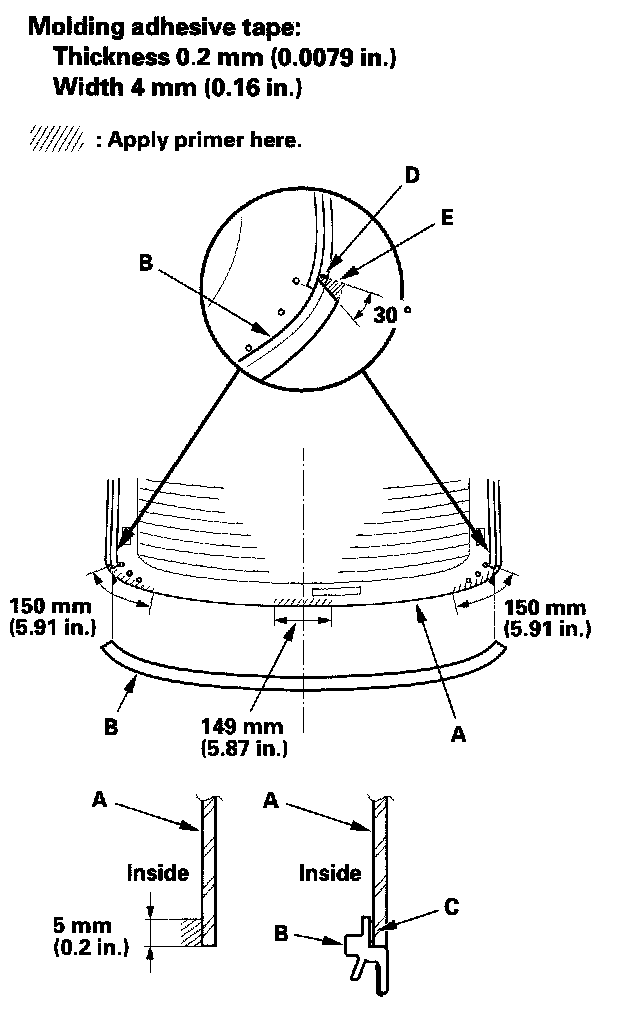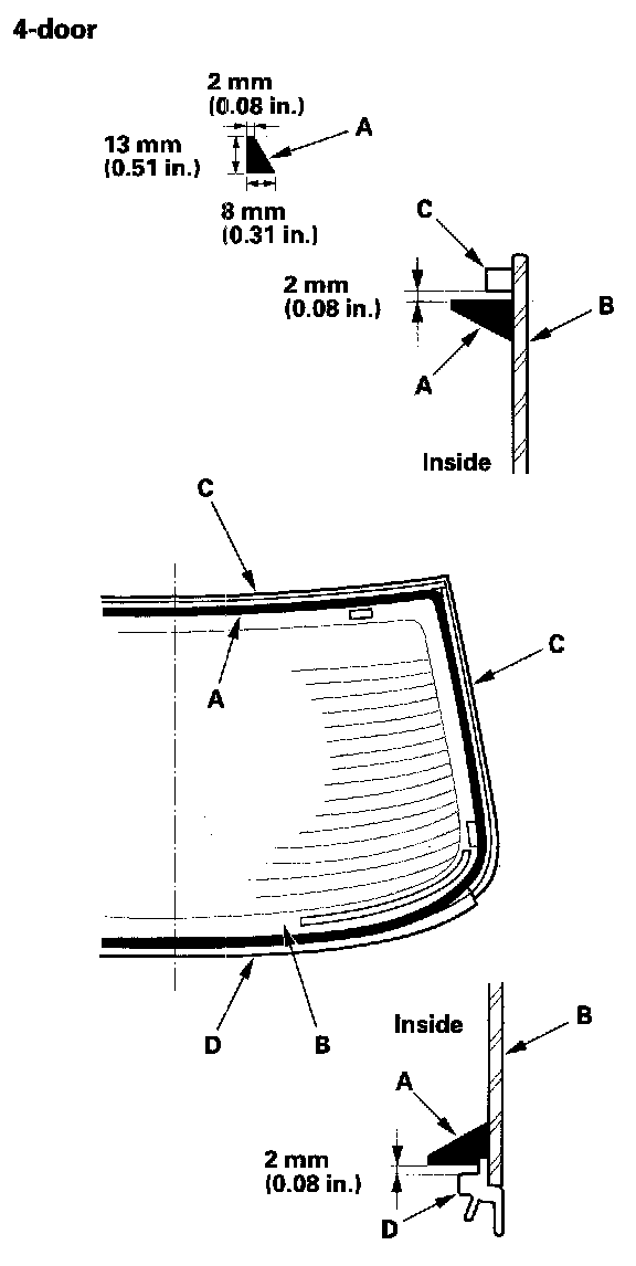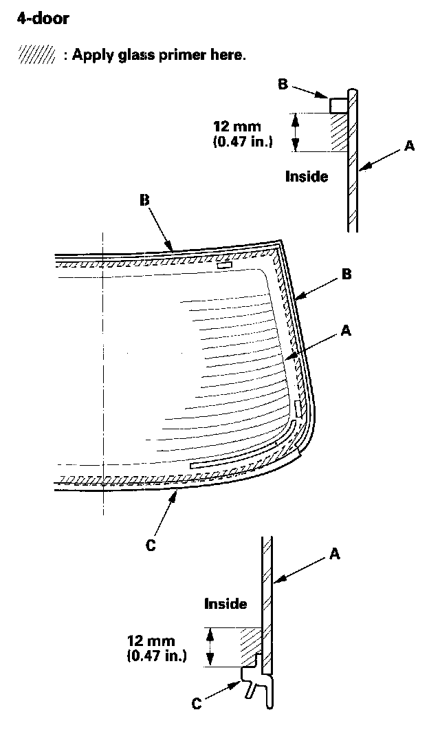 13. 4-door: Apply primer to the edge of the rear window (A) where the molding adhesive tape will be attached as shown. Attach the molding (B) with adhesive tape (C) to the lower edge of the rear window: