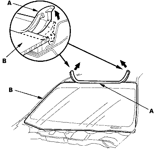 2. Remove the molding (A) from the upper edge of the windshield (B). If necessary, cut the molding with a utility knife.