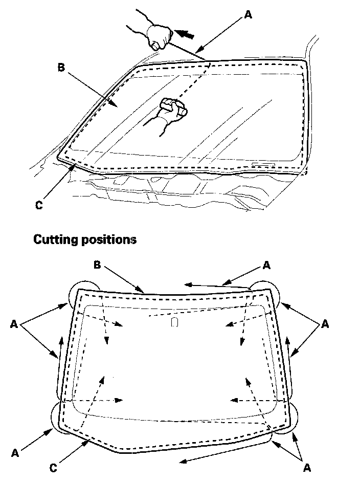 6. With a helper on the outside, pull the piano wire (A) back and forth in a sawing motion. Hold the piano wire as close to the windshield (B) as possible to prevent damage to the body and dashboard. Carefully cut through the rubber dam and adhesive (C) around the entire windshield.