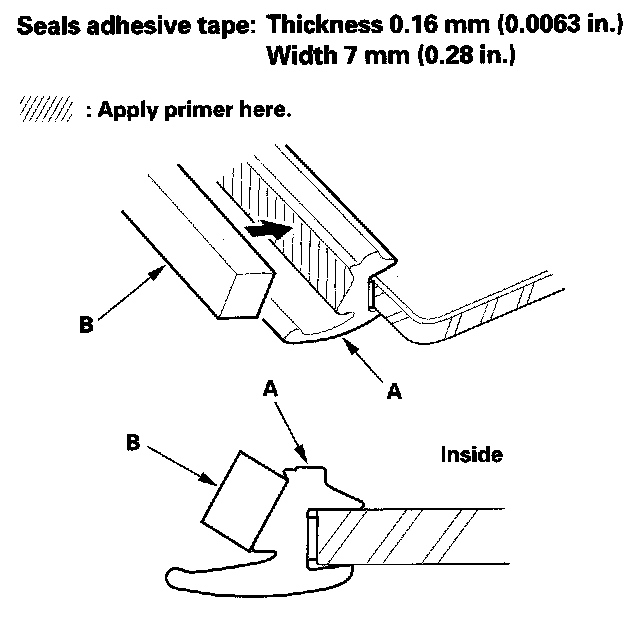 13. Apply primer to the molding (A), then attach the molding upper seal (B) with adhesive tape to the inside surface of the molding as shown.