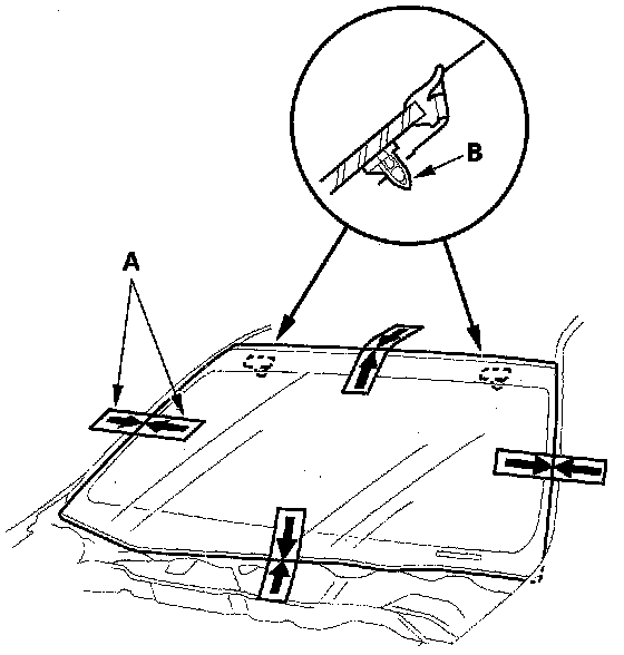 14. Set the windshield in the opening, and center it. Make alignment marks (A) across the windshield and body with a grease pencil at the four points shown. Make sure both clips (B) contact with the edge of the body holes. Be careful not to touch the windshield where adhesive will be applied.
