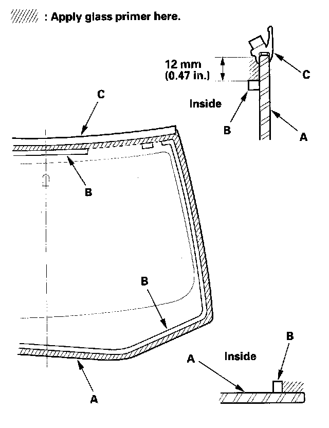 16. With a sponge, apply a light coat of glass primer around the edge of the windshield (A) between the dams (B) and molding (C) as shown, then lightly wipe it off with gauze or cheesecloth: