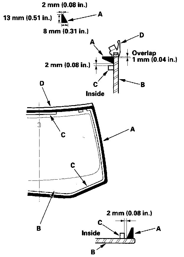 19. Pack adhesive into the cartridge without air pockets to ensure continuous delivery. Put the cartridge in a caulking gun, and run a bead of adhesive (A) around the edge of the windshield (B) between the dams (C) and molding (D) as shown. Apply the adhesive within 30 minutes after applying the glass primer. Make a slightly thicker bead at each corner.