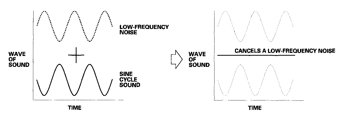 The system includes an active noise control system to cancel some of the vehicle noise. It use a sine-wave shaped sound output to cancel low frequency noise. Two microphones detect the low frequency sound, and the system outputs a canceling sound through the audio speakers.