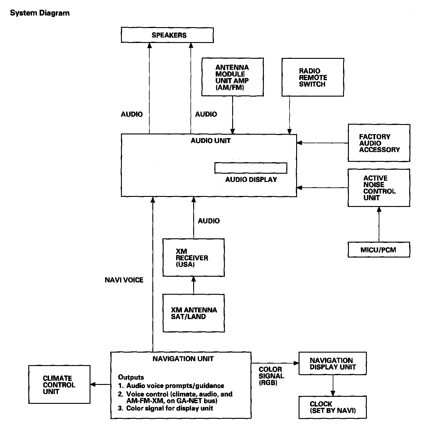 Each audio component passes its audio signal to the audio unit. In addition it communicates with the audio unit via the GA-Net bus. Any open connection in this circuit will cause audio and navigation functions to appear inoperative.