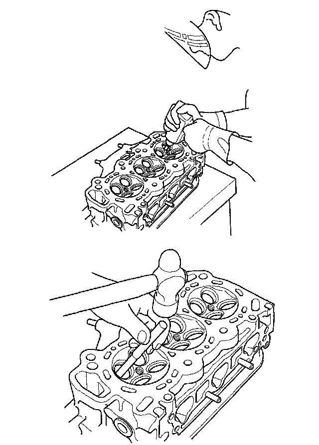 6. Turn the head over, and drive the guide out toward the camshaft side of the head.