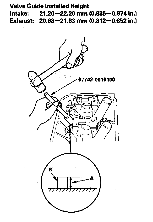 9. Apply a thin coat of clean engine oil to the outside of the new valve guide. Install the guide from the camshaft side of the head; use the valve guide driver to drive the guide to the specified installed height (A) of the guide (B). If you have all 12 guides to do, you may have to reheat the head.
