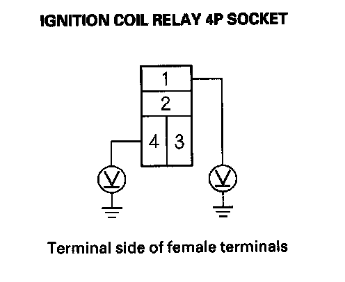 3. Measure the voltage between ignition coil relay 4P socket terminal No. 1 and body ground, then terminal No. 4 and body ground.