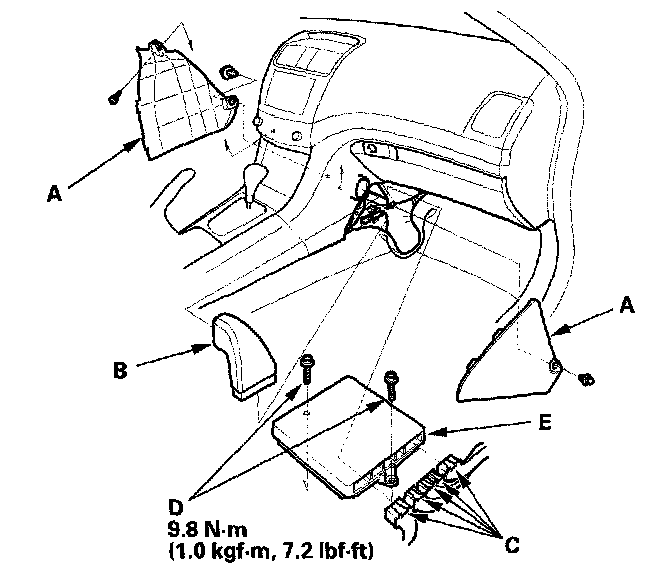 5. Remove the bolts (D), then remove the PCM (E).