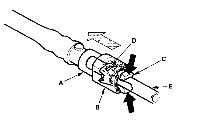 11. Disconnect the quick-connect fitting (A): Hold the connector (B) with one hand, and squeeze the retainer tabs (C) with the other hand to release them from the locking tabs (D). Pull the connector off.