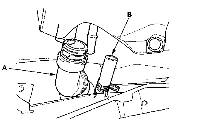 6. Disconnect the fuel fill neck tube (A) and breather hose (B).