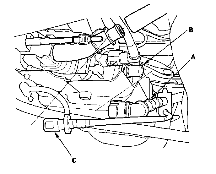 7. Disconnect the vapor line (A) from the EVAP canister (B). then disconnect the fuel line (C).