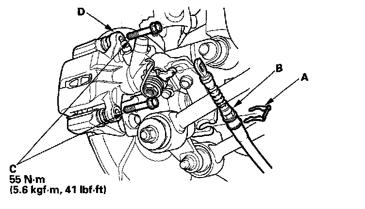 9. Remove the clip (A), parking brake cable (B), two caliper bolts (C), and caliper body (D).