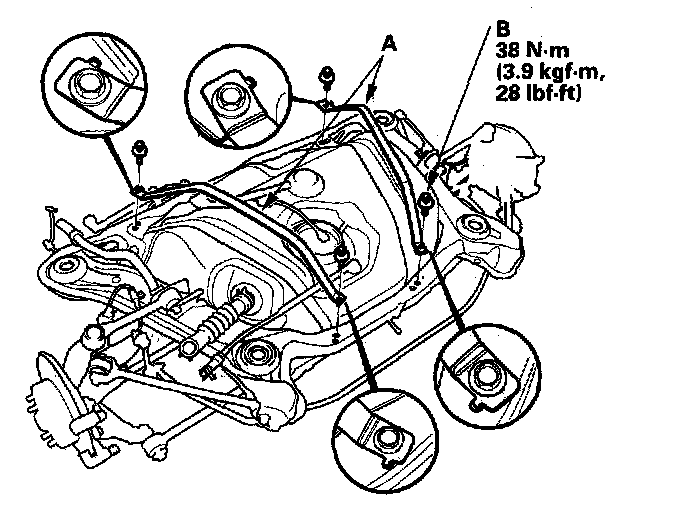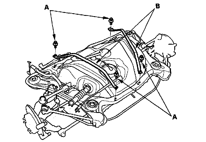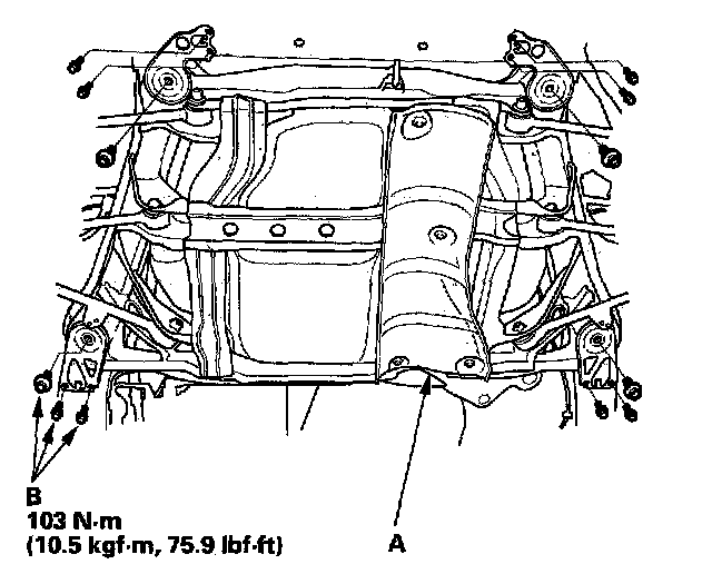 14. Remove the heat shield (A). Place a jack or support under the rear suspension subframe. Remove the mounting bolts (B). Remove the rear suspension subframe.
