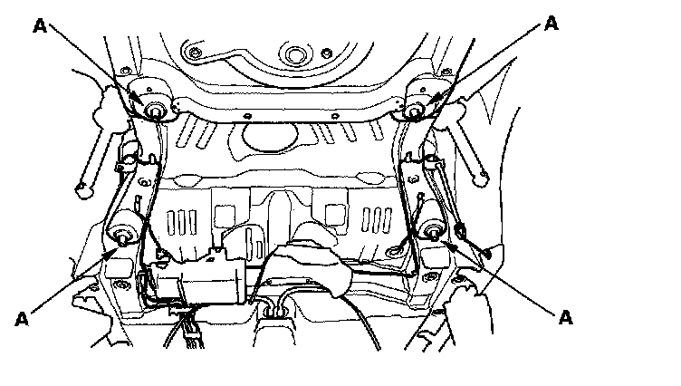 2. Place a jack or support under the rear suspension subframe. Install the subframe, aligning the pins (A) with the holes in the subframe.