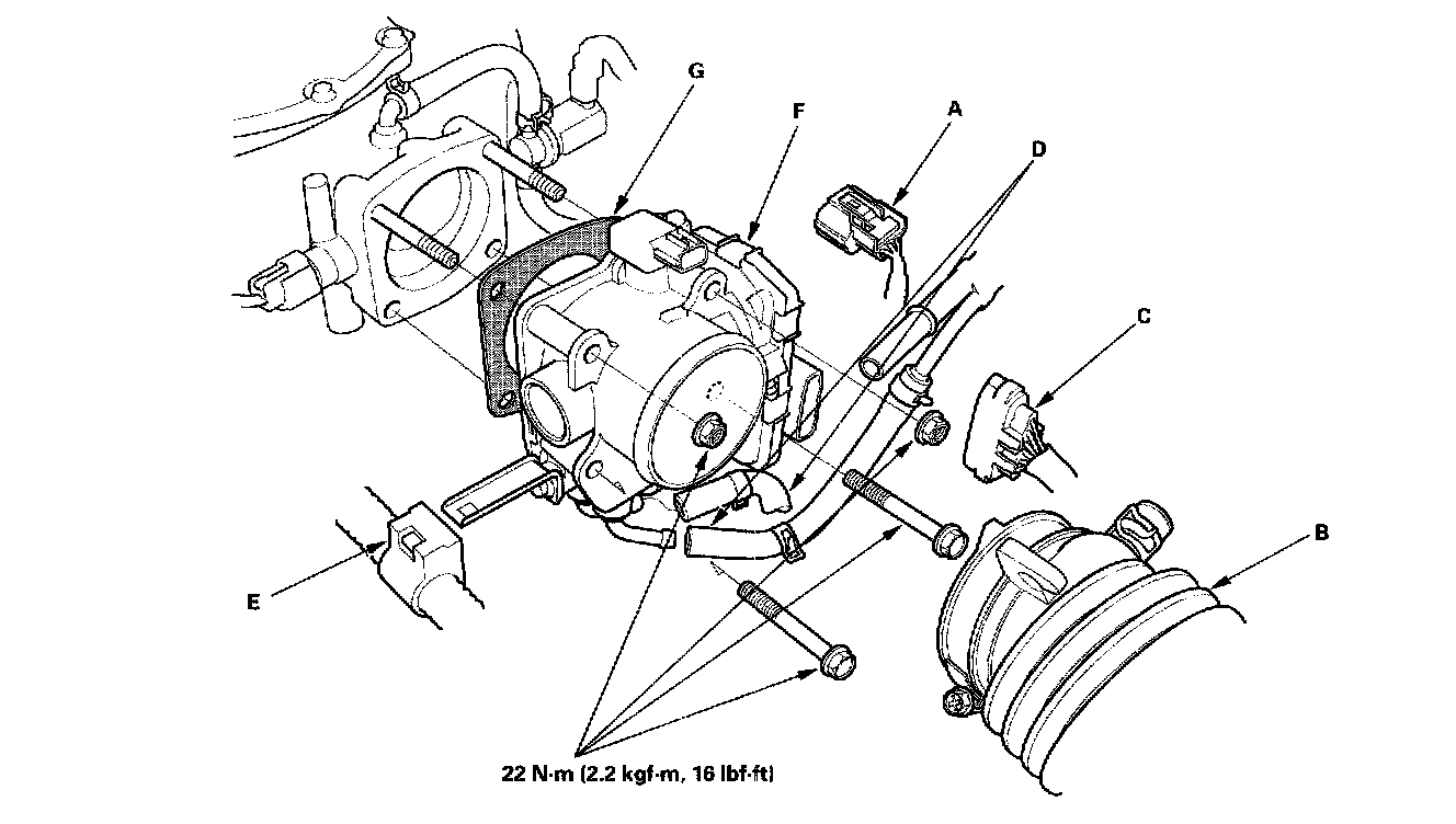 8. Remove the harness clip (E) and the throttle body (F).
