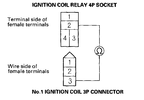 4. Check for continuity between ignition coil relay 4P socket terminal No. 2 and the No. 1 ignition coil 3P connector terminal No. 3.