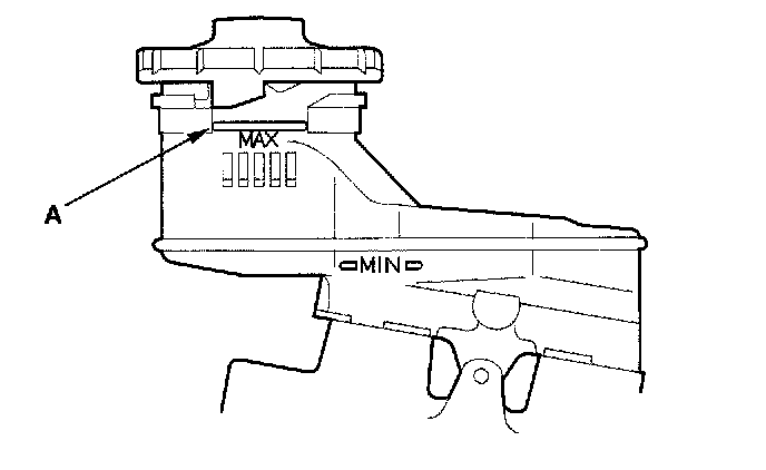 1. Make sure the brake fluid level in the reservoir is at the MAX (upper) level line (A).